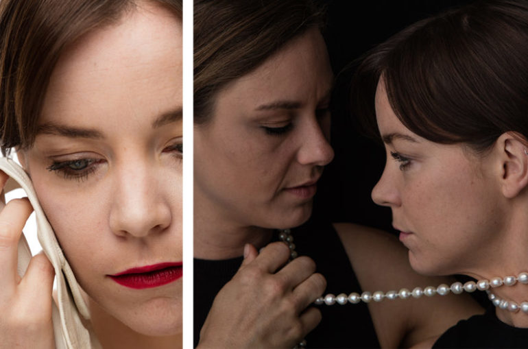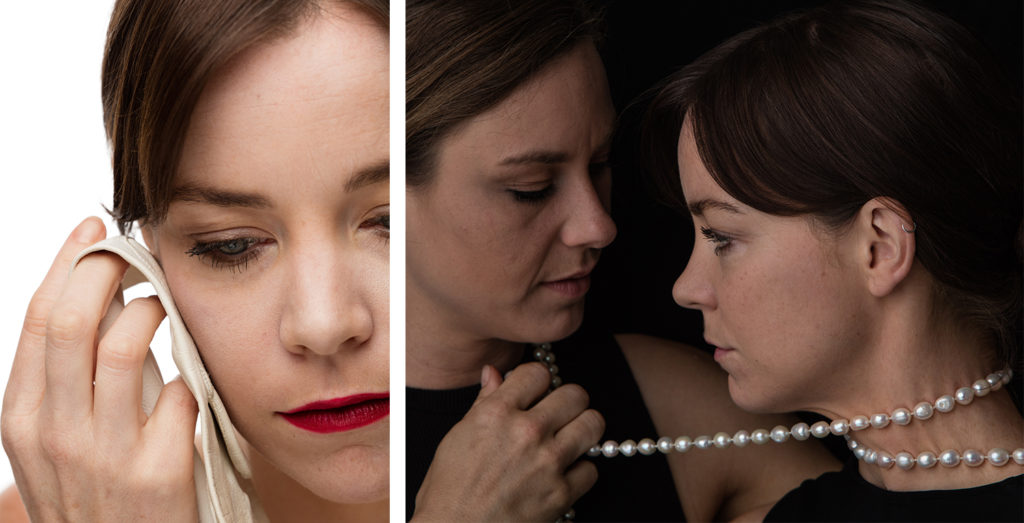 Director Stephanie Shroyer: These are some more ‘classic’ images of role play, as both women try on the role of Madame (Emily Kosloski, not pictured). In The Maids, I want to explore the idea that even the most kind and sensitive of us fall into role-playing. One treats waiters like waiters when expecting to be served in a restaurant. Seeing them as human beings becomes secondary to the roles of the agreed interaction. Yet, the waiters have lives as alive as those they serve. Madame’s “role” is as the master who treats, however kindly, these two maids as subservient. And yet, it was the accident of birth that put her in that position and them in theirs.