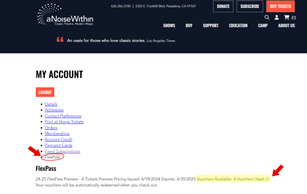 Thank you so much for becoming a subscriber at A Noise Within. We hope you will enjoy the great flexibility of your FlexPass where you can attend any show you’d like with your vouchers. Follow the steps below to learn how to redeem your FlexPass vouchers online.