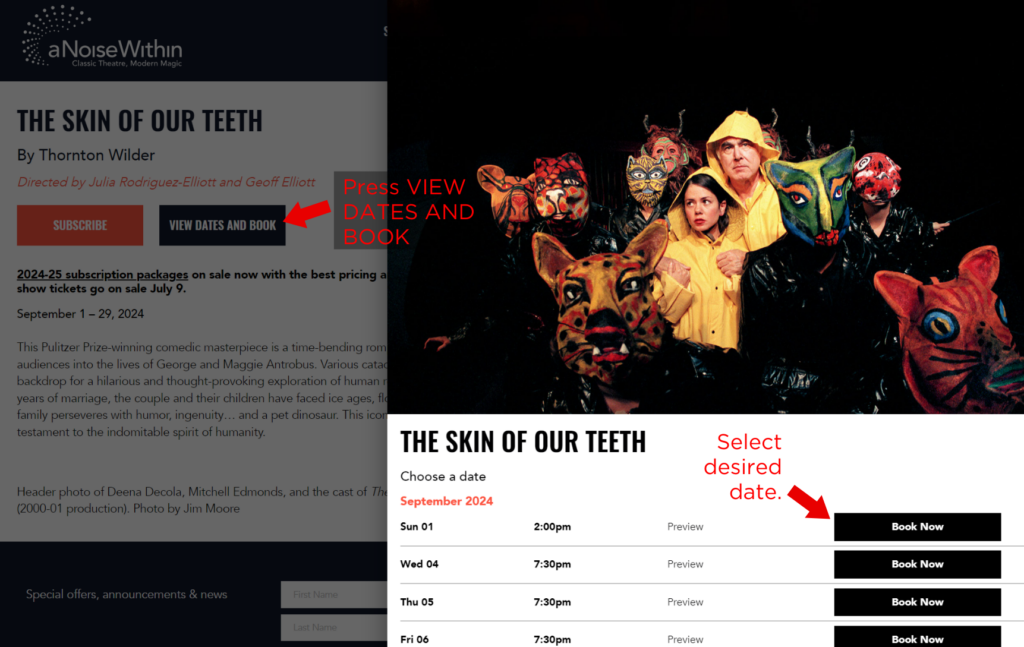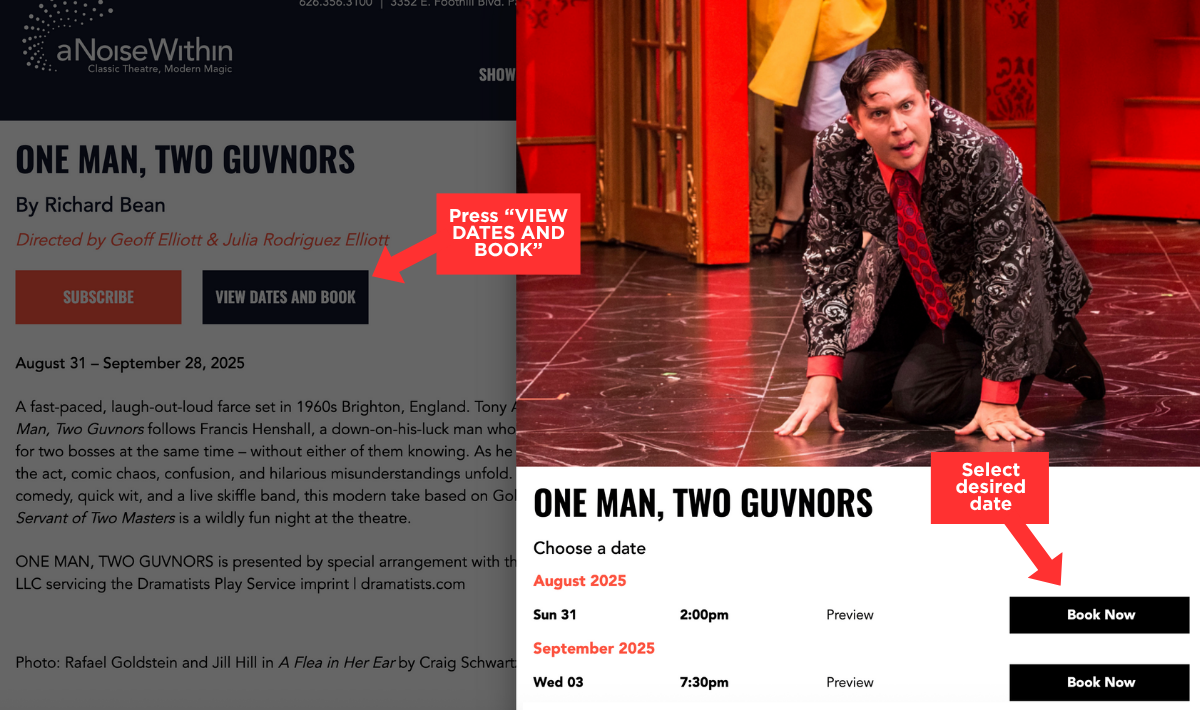 You will have two weeks to pick performance dates or make exchanges before tickets go on sale to the general public, and can continue throughout the season. Contact the Box Office at boxoffice@anoieswithin.org or 626.256.3121 for more information on selecting dates.