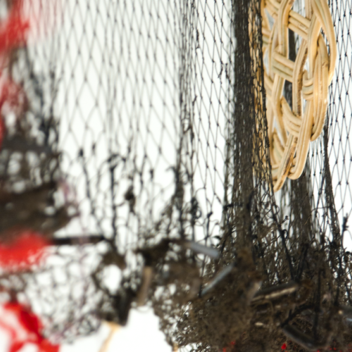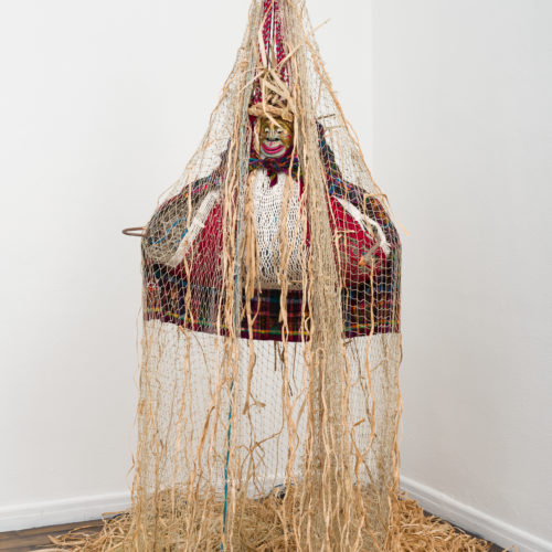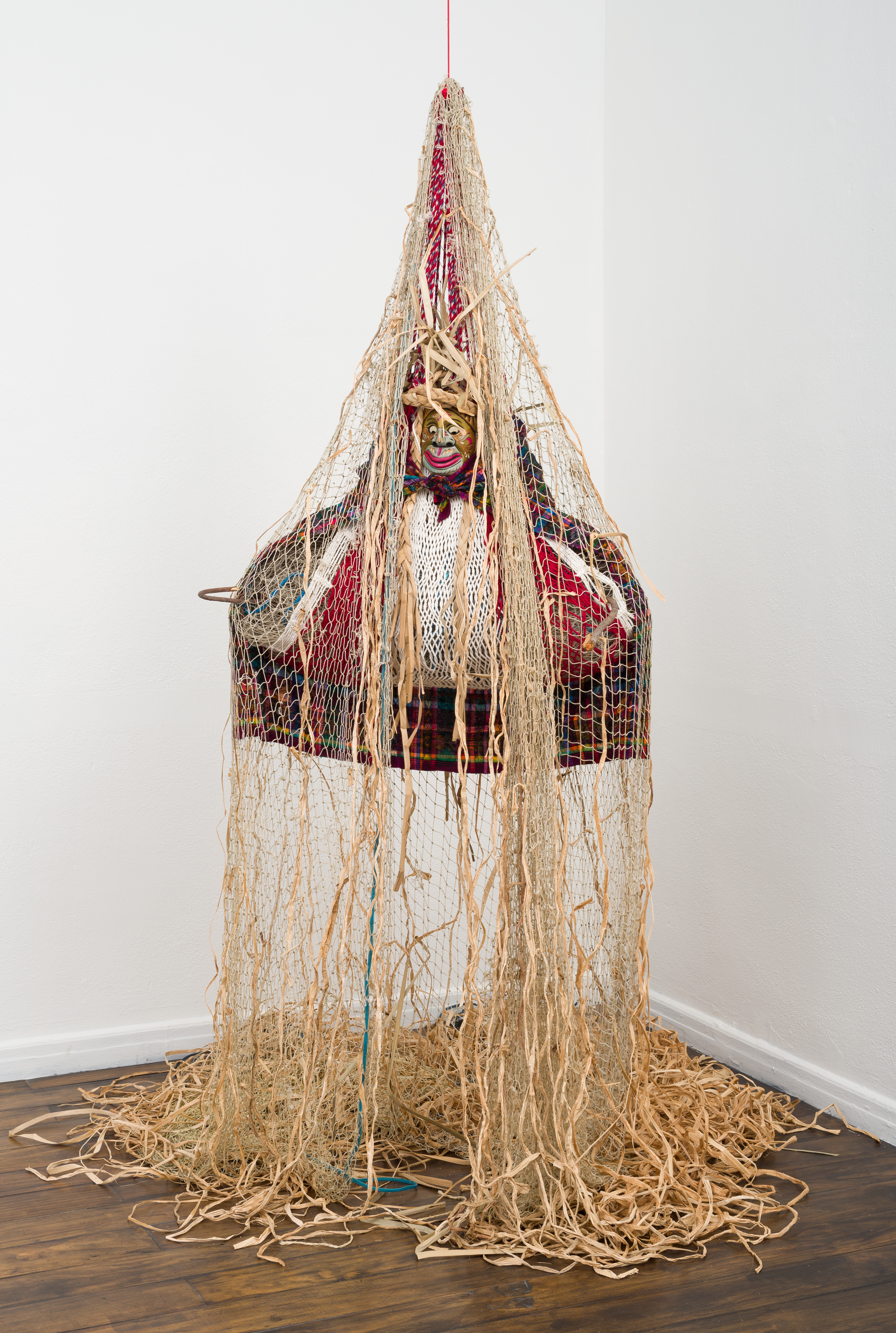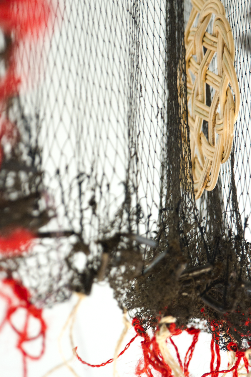 Cosmotarrayas is a series of hanging sculptures assembled with handmade fishing nets collected during the artist’s field research in riverine communities affected by the privatization of water. The nets are intervened with a variety of objects that she acquires in a range of locales or that come from her personal archive. Some of the nets were given to the artist by friends or acquaintances in the sites she visits, while others were purchased in local markets or commissioned by the artist. The Cosmotarrayas works are embodiments of people the artist has met during her travels and their stories of dispossession and resistance; the series operates as a connector between her activism and community involvement and her studio practice.