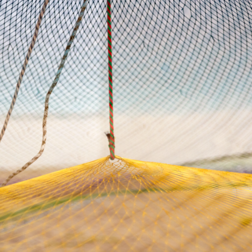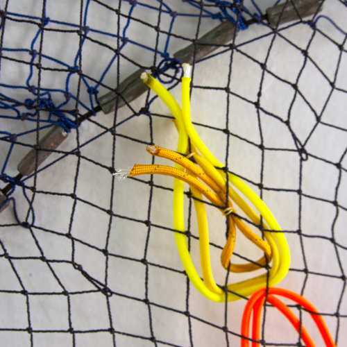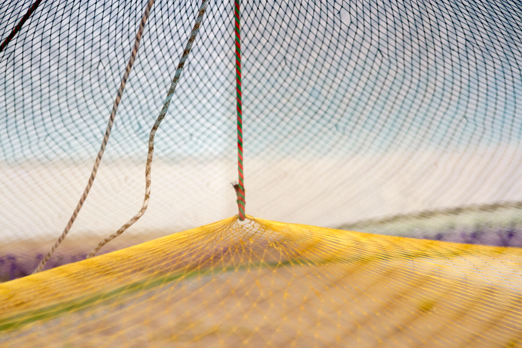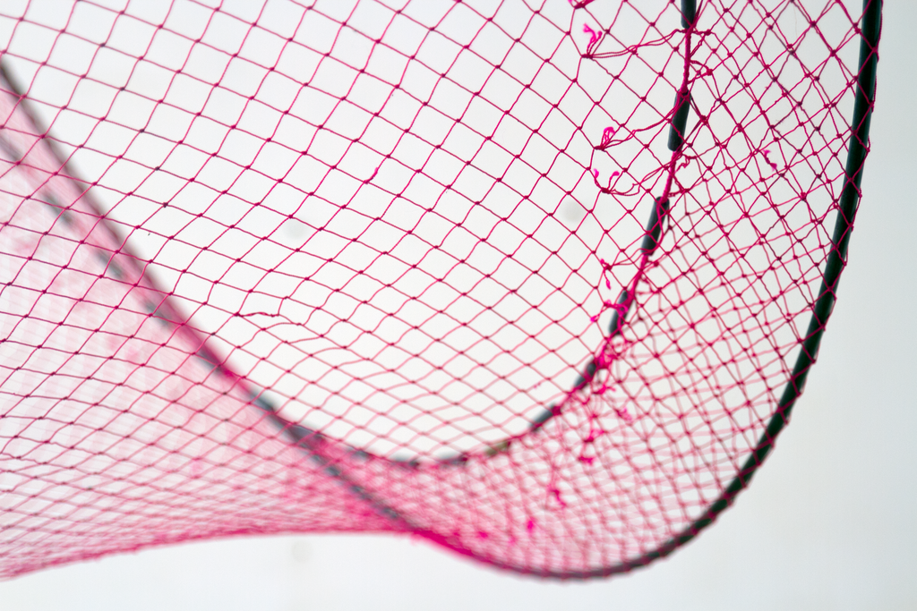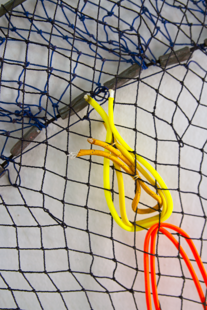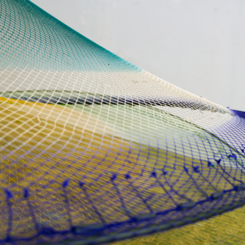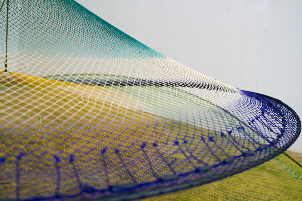 The net, with its combination of porousness and strength that comes from its rhizomatic structure, reflects the inherent connectivity among beings. The word “atarraya” translates to “cast net” and comes from the Arab word “atarrahar,” which means “to throw.” Caycedo’s work argues that we must reimagine and reorient our relationship to water, to resist notions of the river as a resource to be exploited and, rather, to understand it as a living entity that has an almost endless capacity for giving and sustaining when cared for. To throw a fishing net affirms the river as a common good. The Cosmotarrayas series makes part of Caycedo’s ongoing project Be Dammed, that examines the ecological, economic, and psychological impacts of dams building and water extractivism.